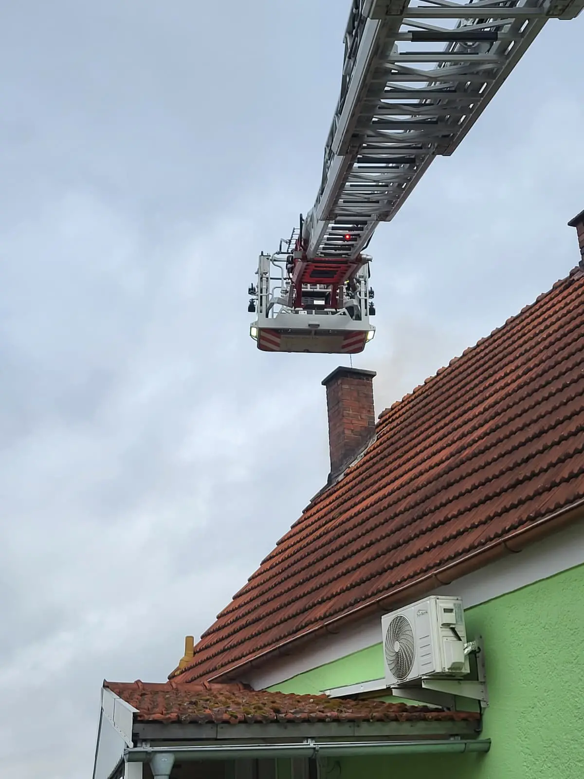 🪜 Über die Drehleiter wurde der Kamin geöffnet, um ein Verschließen durch brennenden Ruß zu verhindern. So konnte ein gefährlicher Hitzestau mit hohem Druck vermieden werden.